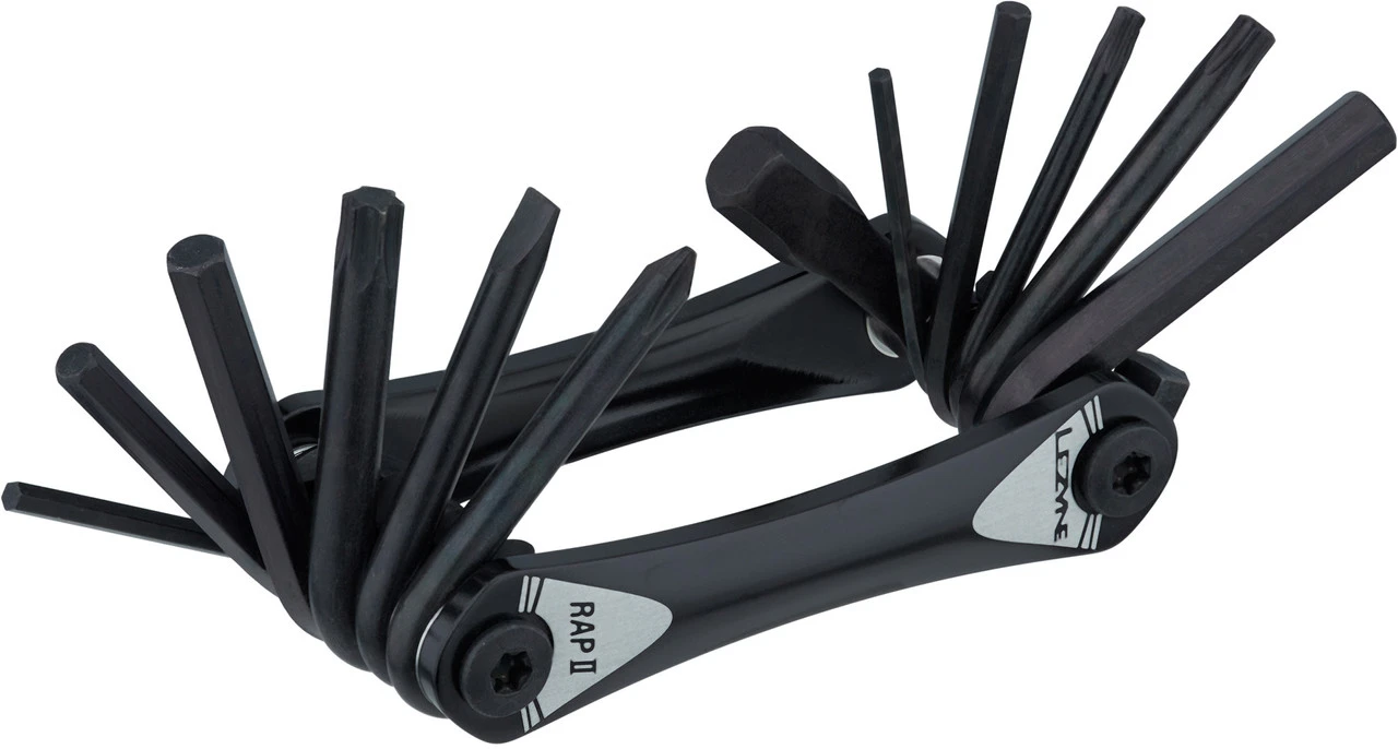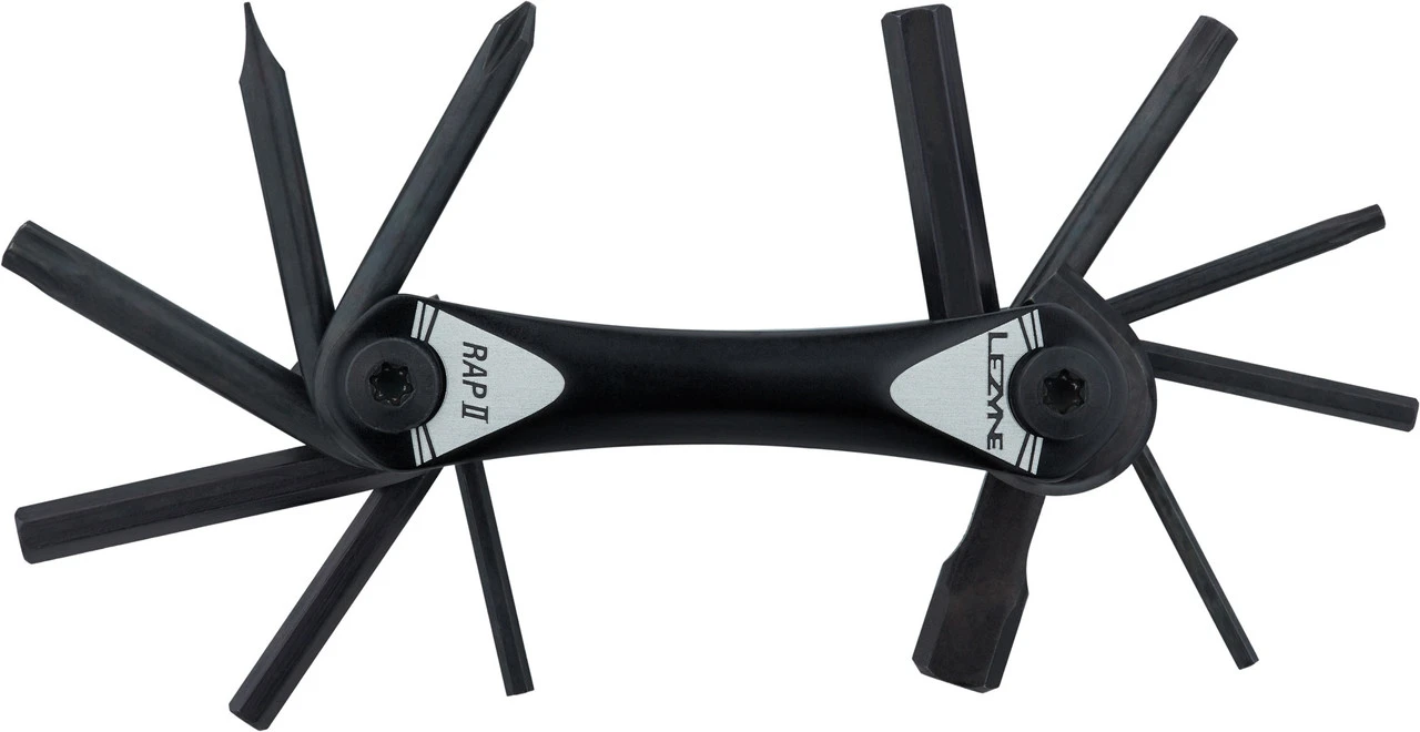 Mit dem RAP II 12 Multitool von Lezyne hast Du zwölf Steckschlüssel und Schraubendreher für kleine Reparaturen unterwegs immer dabei. Die Chrom-Vanadium-Stahl-Tools sind gegen Korrosion behandelt und werden von seitlichen Panels aus Aluminium geschützt.