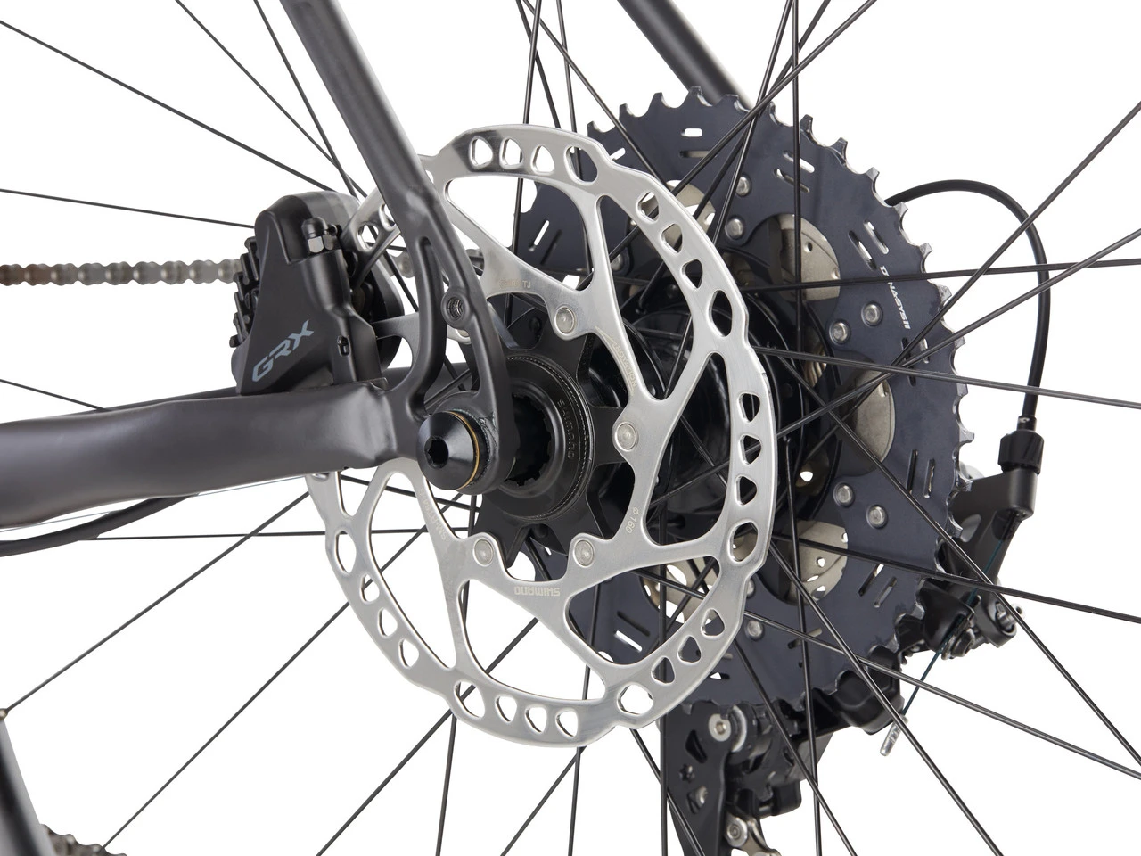 Das tout terrain Vasco GT Select 22.3 Gravelbike in der exklusiven bc edition ist bereit für die Gravel-Wege dieser Welt. Der stabile Stahlrahmen mit 28″ großen DT Swiss Laufrädern und 44 mm breiten tubeless-kompatiblen WTB Reifen überzeugt mit seiner Langlebigkeit auf Schotter wie auf Asphalt. Dank der Carbon-Gabel bleibt das Gewicht niedrig, sodass Du auch auf Bikepacking-Touren hervorragend vorankommst. Damit Dein Gepäck Platz am Bike findet, sind sowohl Rahmen als auch Gabel mit zahlreichen Befestigungsösen ausgestattet. Auch einen Gepäckträger montierst Du bei Bedarf problemlos. Sogar voll beladen sind Höhenmeter kein Hindernis für Dich. Mit der bewährten 1×11-fach Gravel-Antriebsgruppe GRX und Deore-Kassette von Shimano sowie einer leichten Untersetzung von 40:42 erklimmst Du auch steilere Anstiege ohne Schwierigkeiten. Dank des kleinen 11-Zähne-Ritzels bist Du aber auch in der Ebene zügig unterwegs.